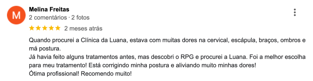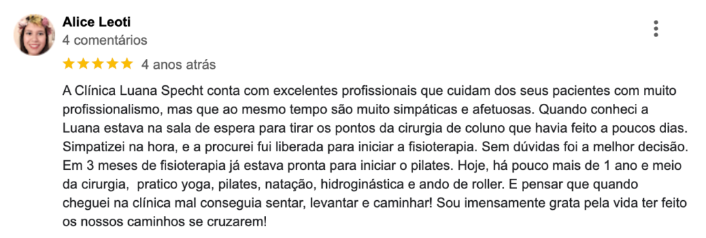 EXCELENTE Com base em 82 avaliações Publicado em Patrícia Ruas Dias09/07/2025Trustindex verifica se a fonte original da avaliação é Google. A Luana é excepcional! Tenho problema de coluna há anos e minha vida melhorou muito depois que comecei a fazer tratamento com ela. Além de ótima profissional, é uma querida.Publicado em Claire Lemos Hernandes23/05/2025Trustindex verifica se a fonte original da avaliação é Google. Os atendentes são muito prestativosPublicado em Juliana Milano Cogno22/05/2025Trustindex verifica se a fonte original da avaliação é Google. A Luana, fisioterapeuta e proprietária da clínica após avaliação do meu caso pensou em um plano de tratamento personalizado de RPG, Osteopatia e Pilates. Tenho confiança e acredito no comprometimento dos profissionais da clínica e acredito que com a prática do pilates ficarei cada vez melhor. Gratidão🙏🏻😍Recomendo!Publicado em Vinicius Gehlen21/05/2025Trustindex verifica se a fonte original da avaliação é Google. Pessoal muito atencioso com excelentes profissionais.Publicado em Gabriele Tuchtenhagen21/05/2025Trustindex verifica se a fonte original da avaliação é Google. Excelente espaço e profissionais maravilhosos! Muito acolhedores e capacitados!Publicado em Antonio Ferreira21/05/2025Trustindex verifica se a fonte original da avaliação é Google. Clinica top ......pra mim melhor da cidade...... ambiente agradável e atendimento de primeira linha....🙏🙏🙏🙏🙏🙏🙏Publicado em Elza Damasio21/05/2025Trustindex verifica se a fonte original da avaliação é Google. Minha experiência com a Clínica é das melhores: excelentes profissionais experientes e dedicados , acolhendo os seus pacientes com carinho e amizade.